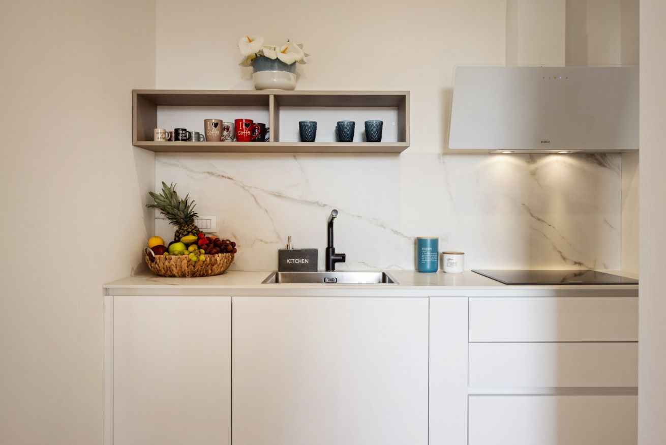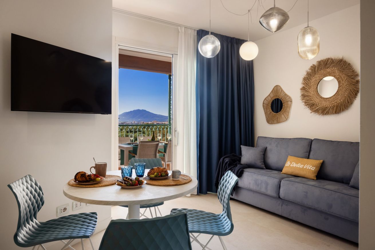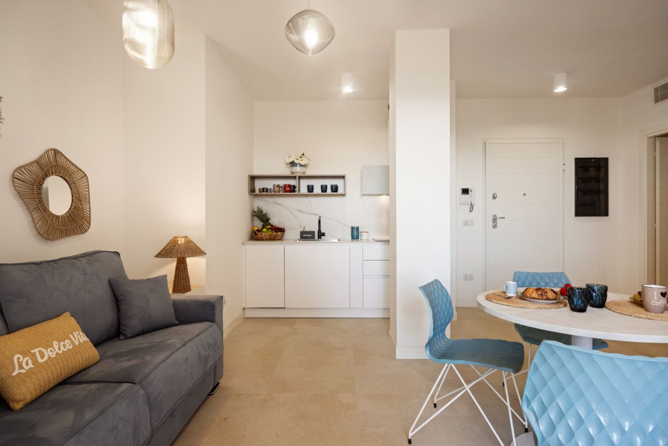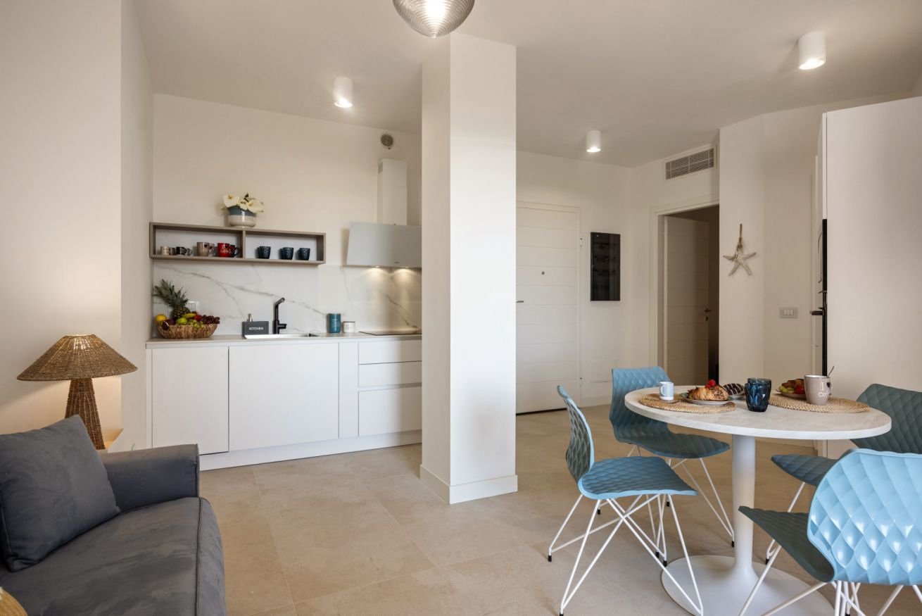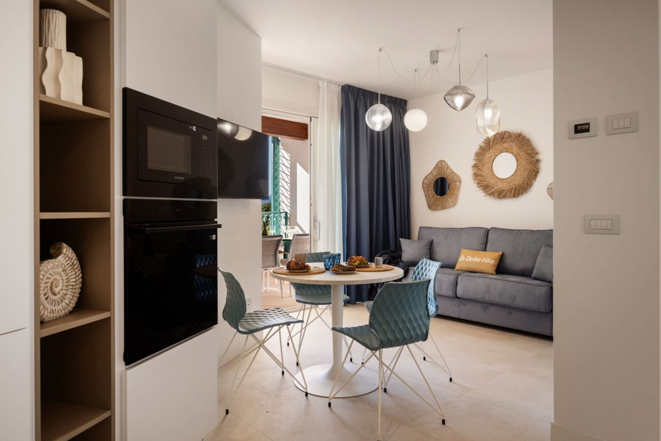 Bright living area with a veranda overlooking the park and the Gulf of Olbia, perfect for enjoying stunning sunsets. Fully equipped kitchenette with modern appliances, designed for a practical and comfortable stay.