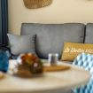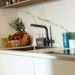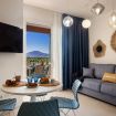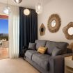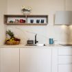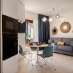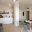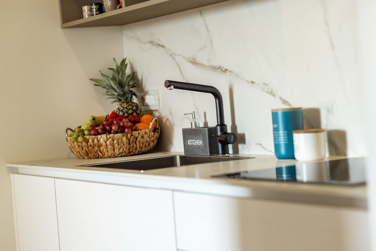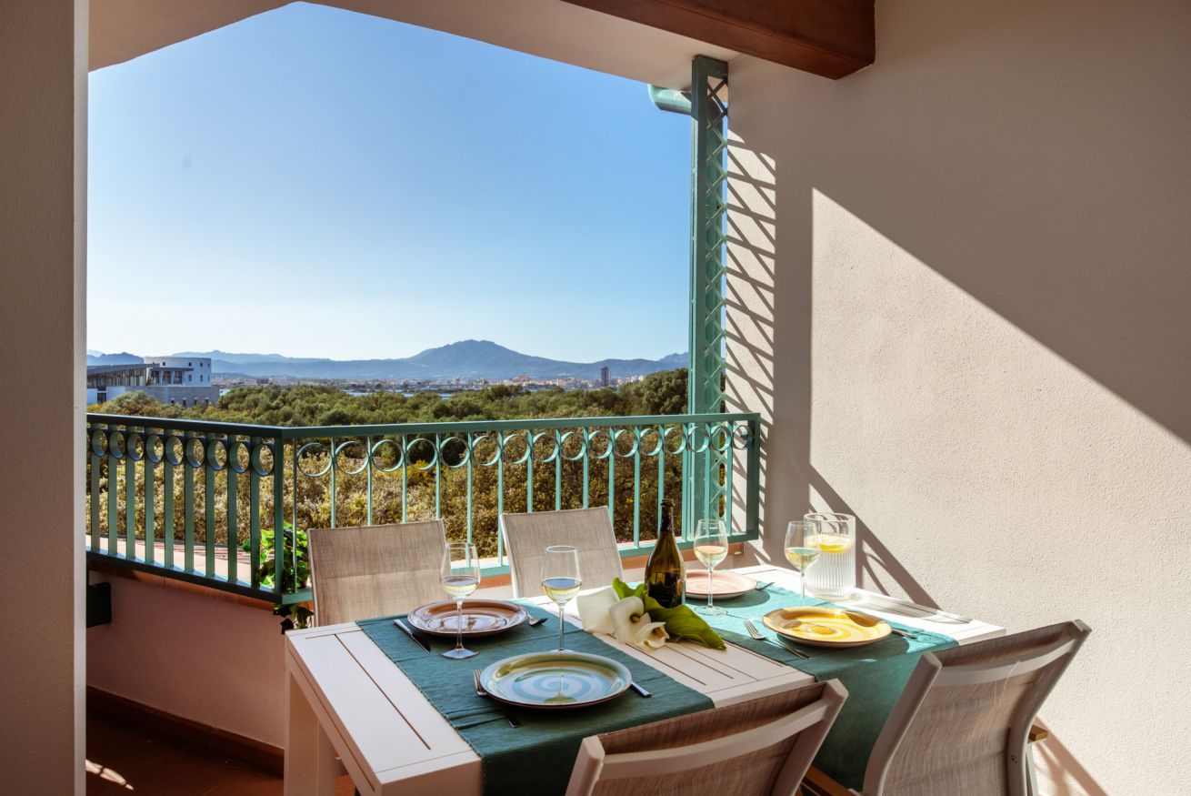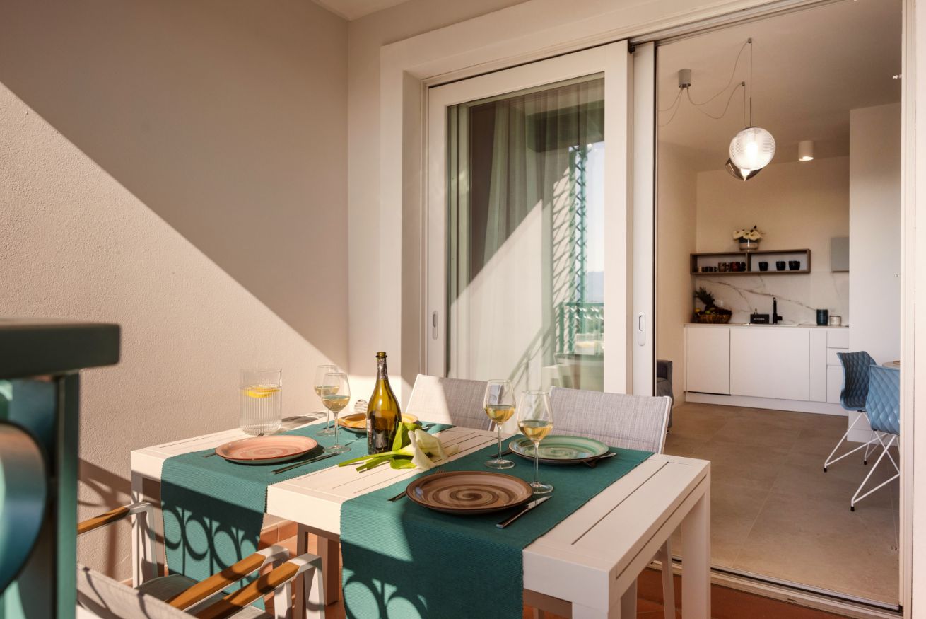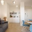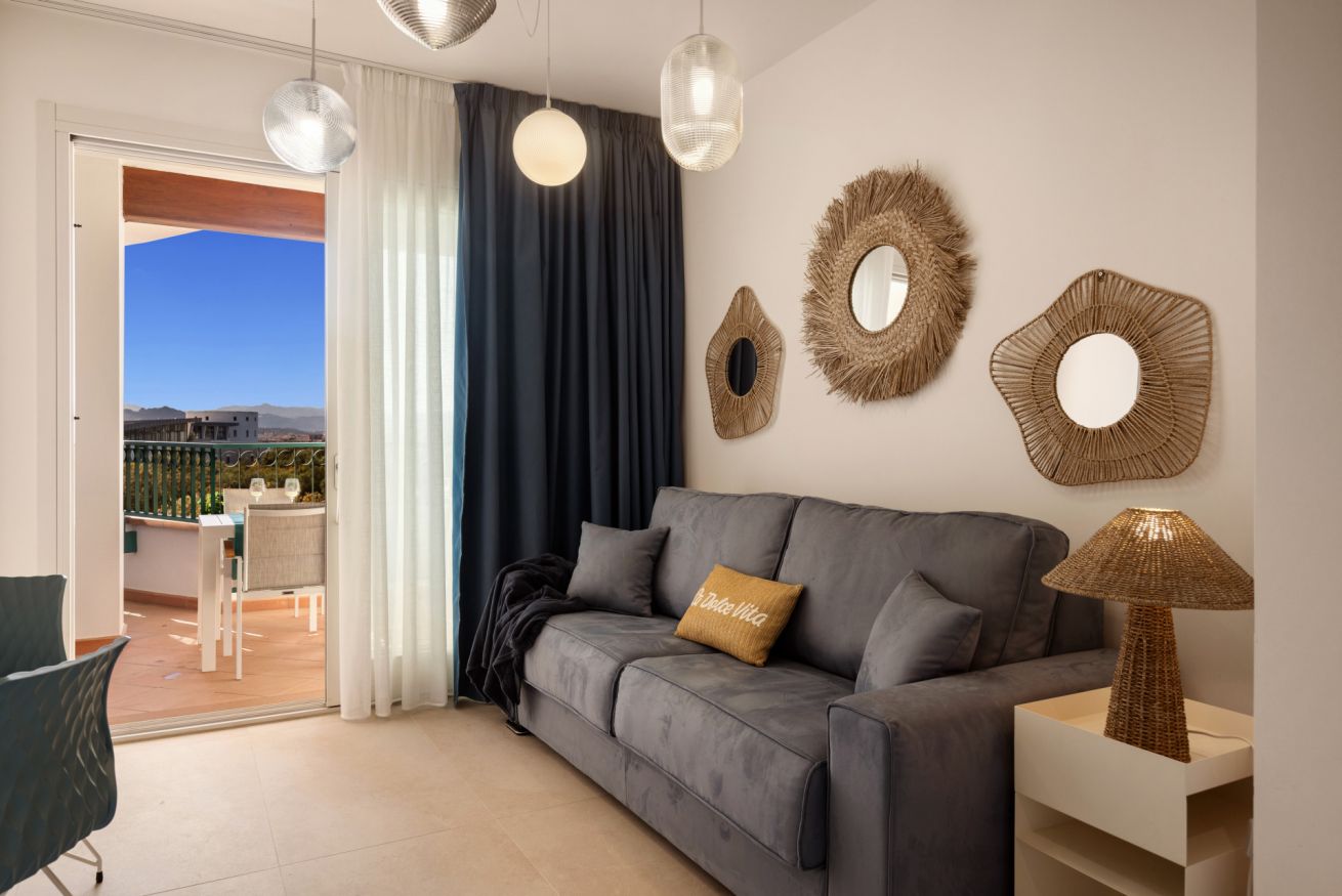 Bright living area with a veranda overlooking the park and the Gulf of Olbia, perfect for enjoying stunning sunsets. Fully equipped kitchenette with modern appliances, designed for a practical and comfortable stay.