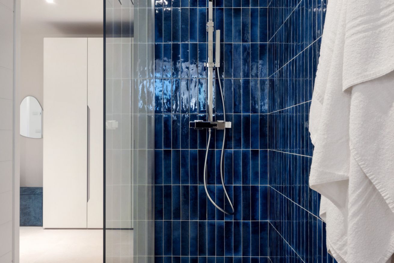 The sleeping area features a refined double bedroom with high-quality design finishes, while the modern bathroom includes a spacious and comfortable shower.